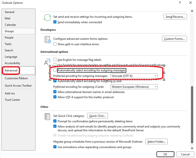 This issue only affects environments where Outlook’s encoding has been changed or defaults to ISO.